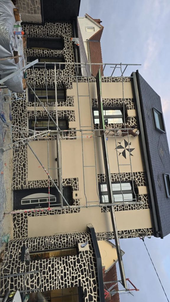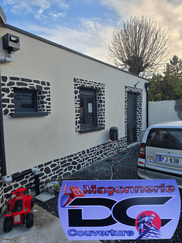 Mise en place d’un enduit projeté grattée couleur ton-pierre avec sous bassement et entourage de fenêtres en deco-pierre et façade hexagonale en deco-pierre couleur noire