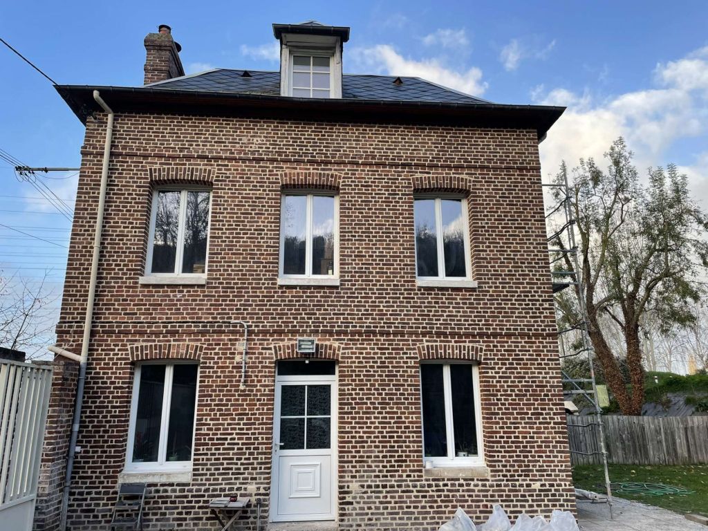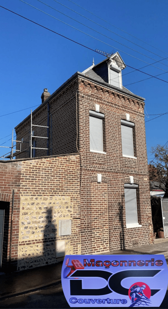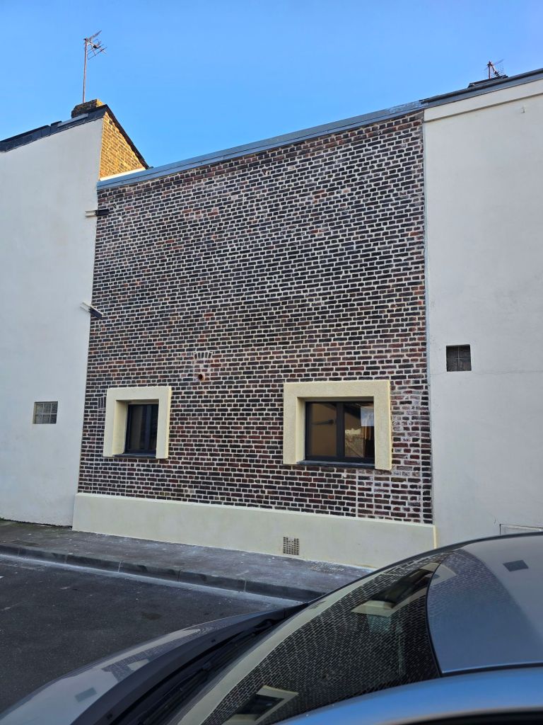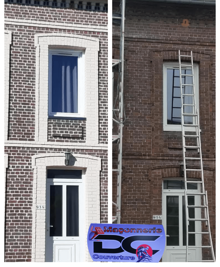 Rejointement d’une façade complète en briques en joints à la chaux couleur ton-pierre