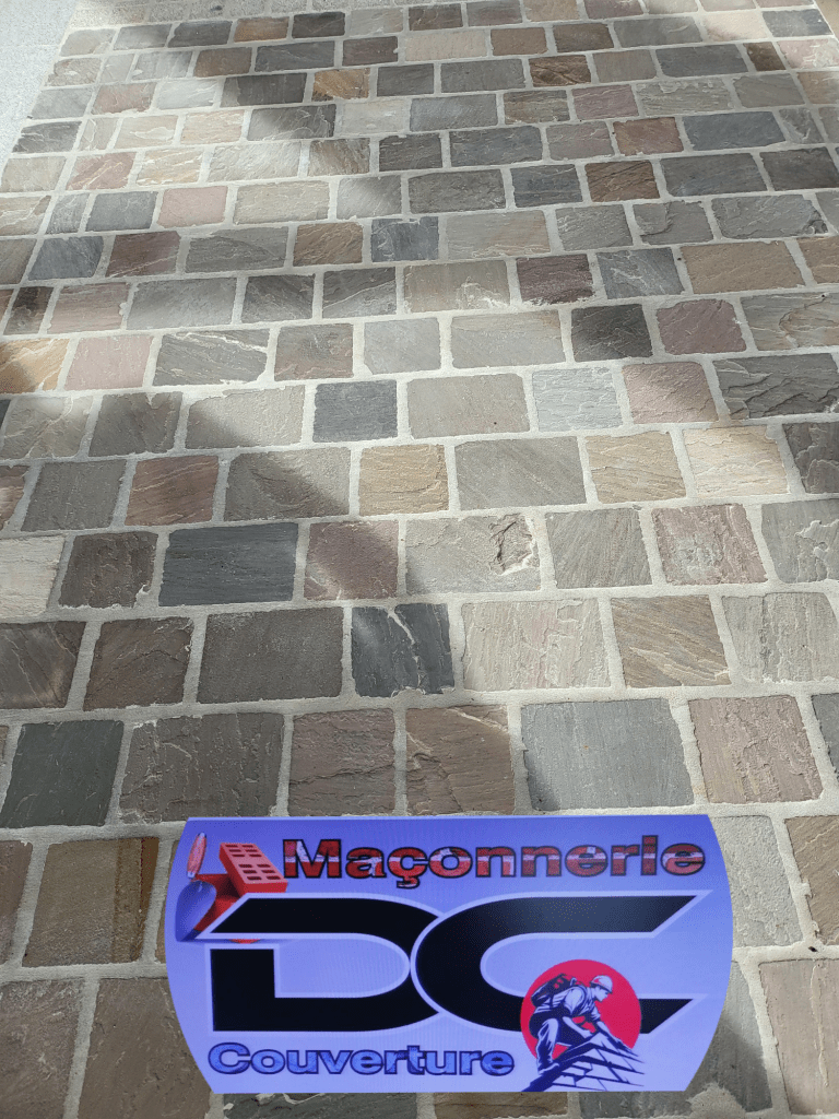 Pose de pavé en 3 formats avec joints à la chaux couleur ton-pierre