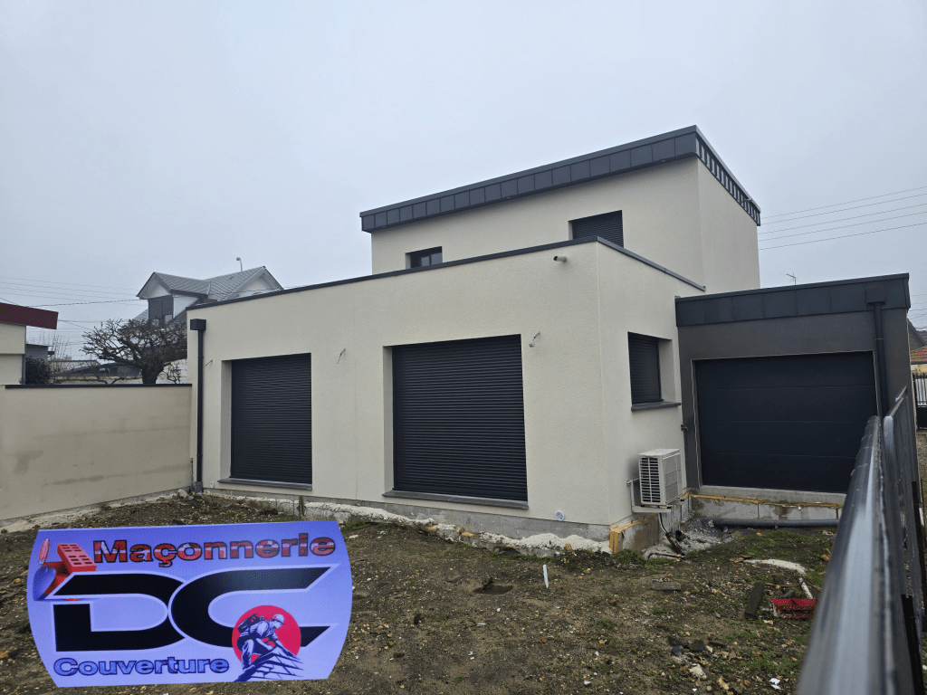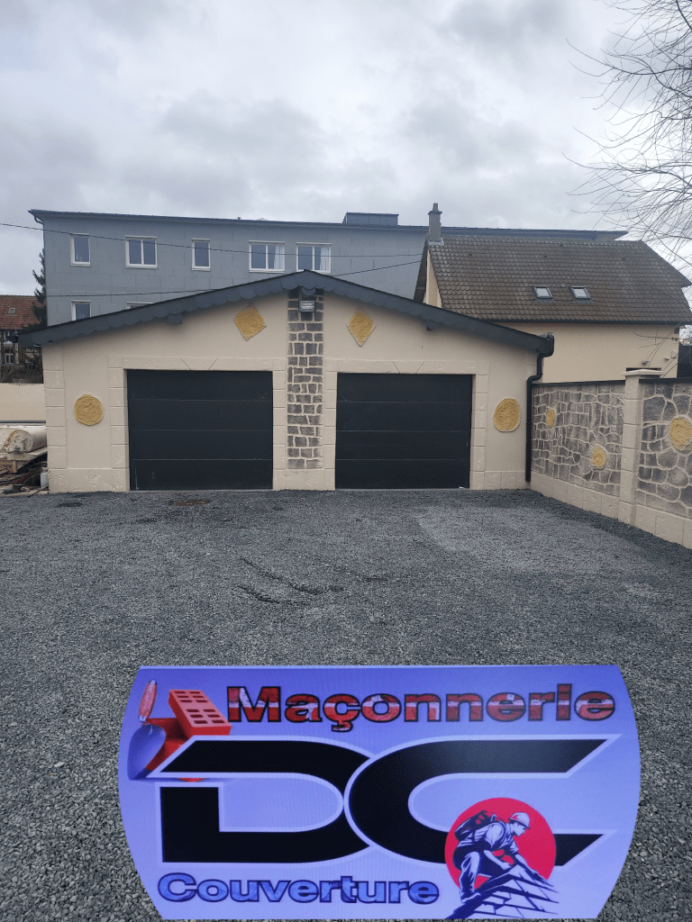 Création d’un garage double avec une toiture en ardoise 32×22 naturel pose de gouttiere en zinc anthracite et la pose de deux porte de garage sectionnel couleur gris 7016