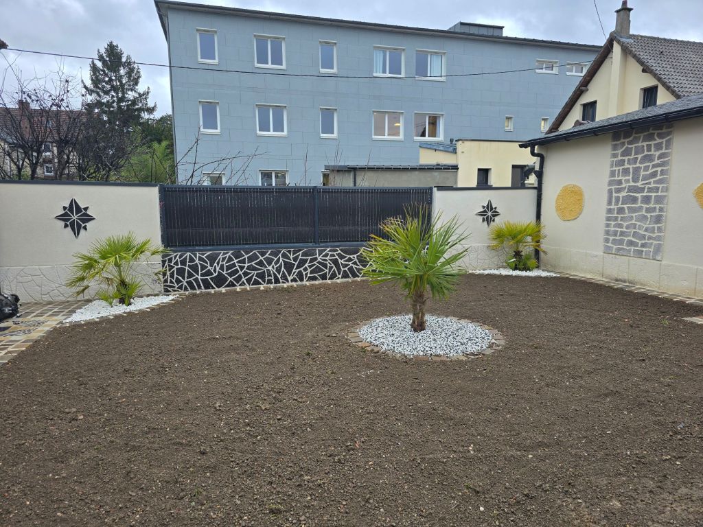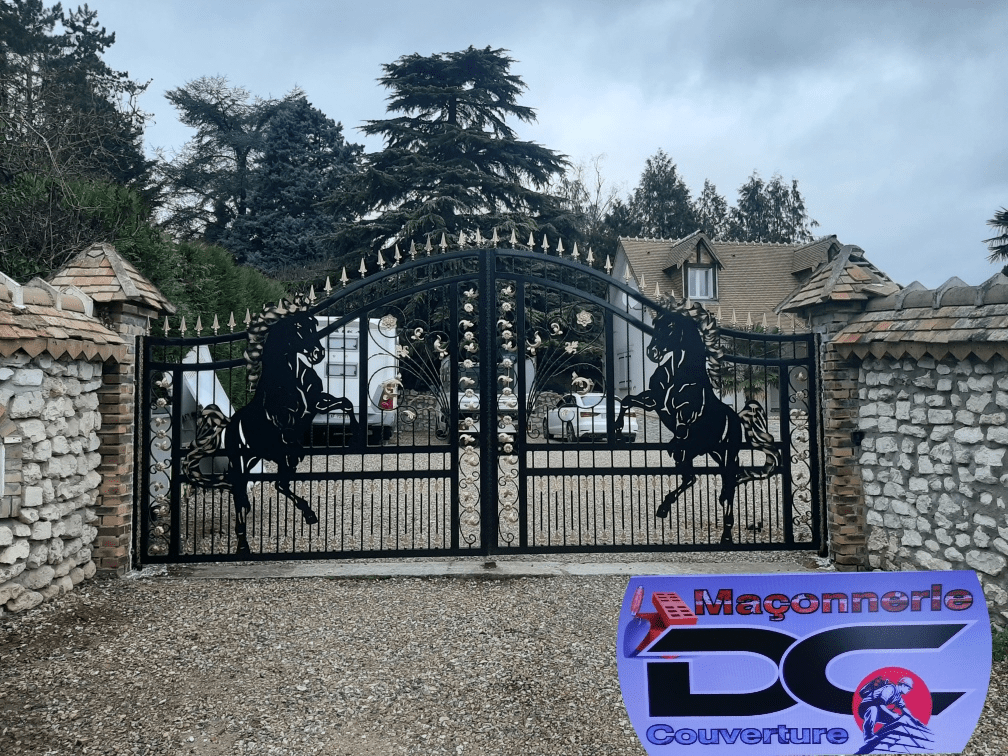 Creation de quatre pilliers en 60×60 avec la Creation d’un muret de séparation de chaque côté avec enduit deco-pierre sur pillier et muret et la fourniture et pose d’un portail en fer forgé sur mesure deux battant avec logo cheval