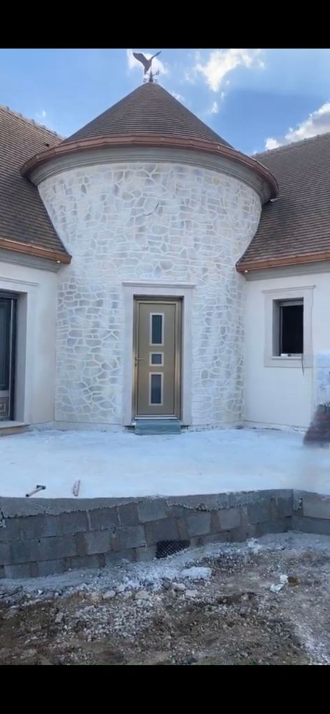 Mise en place d’un enduit deco-pierre sur la tour et enduit blanc finition grattée et entourage de porte et fenêtre finitions épongé