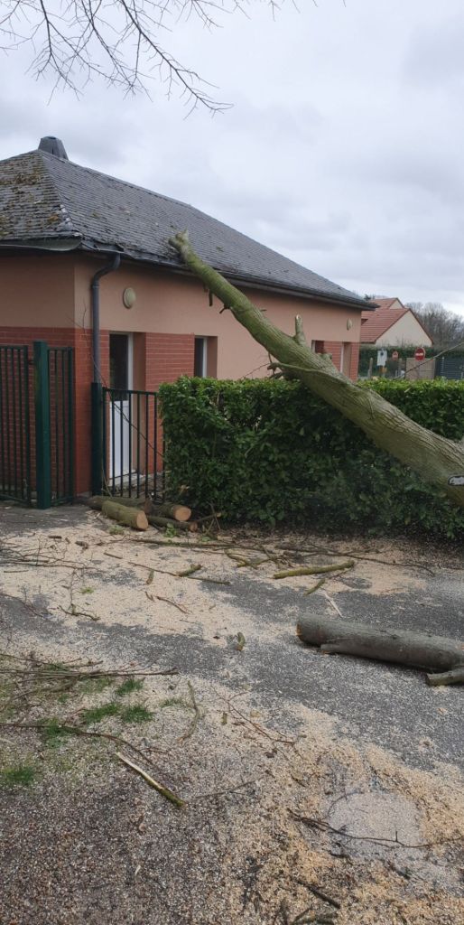 Enlevement d’un arbre tomber sur une cantine scolaire avant la réparation de la toiture a cause des dégâts causé par la chute de l’arbre