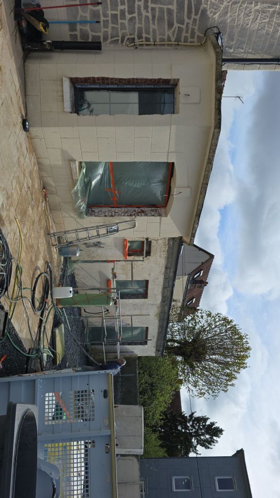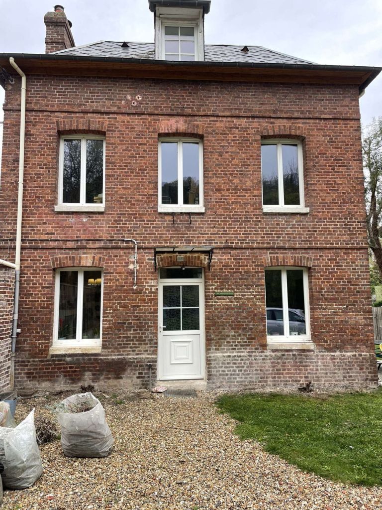 Après le reboucher d’une ancienne porte et la création de deux nouvelles fenêtres et la réfection des joints de briques à la chaux et la mise en place d’un enduit projeté à la chaux au tour des fenêtres et au niveau du soubassement